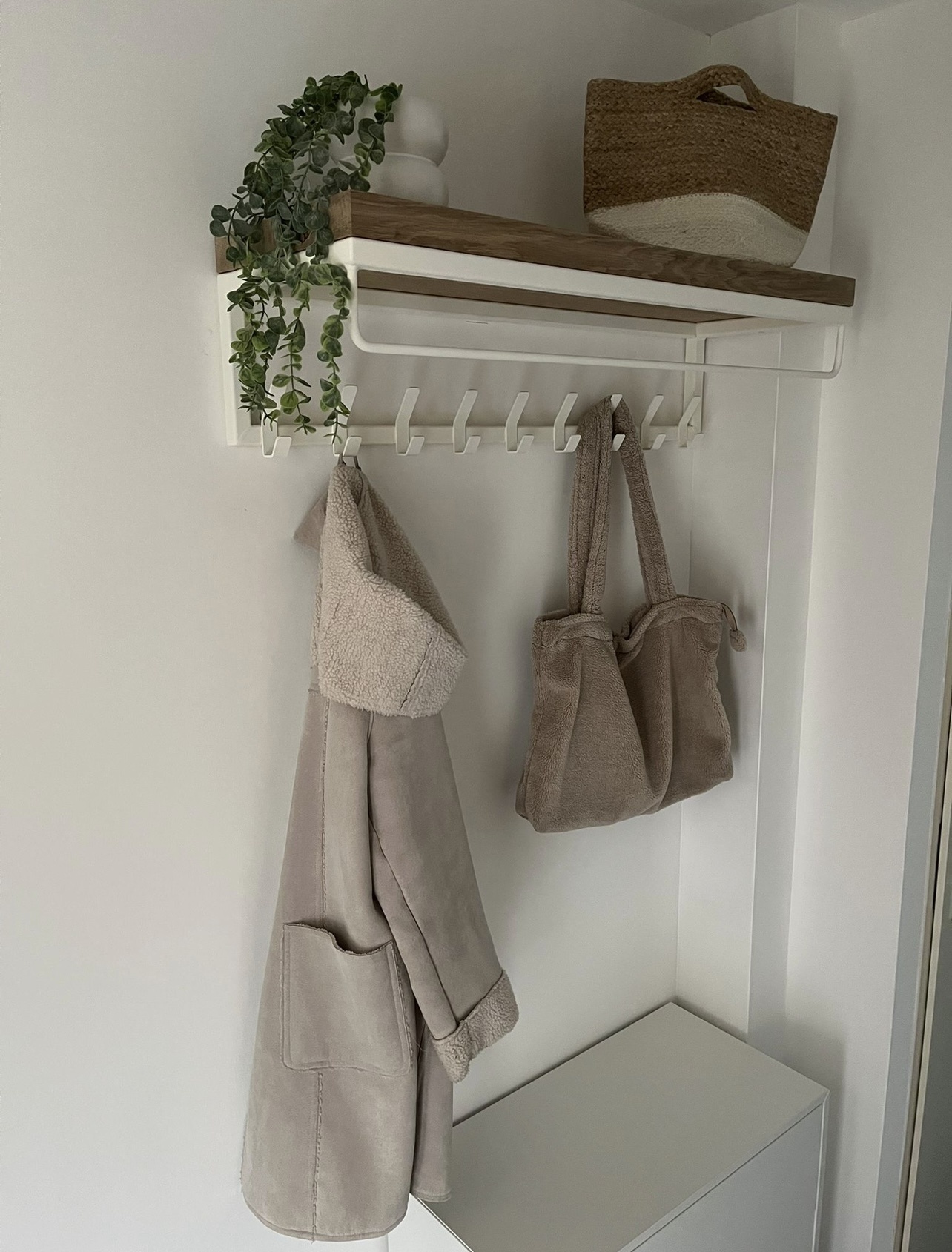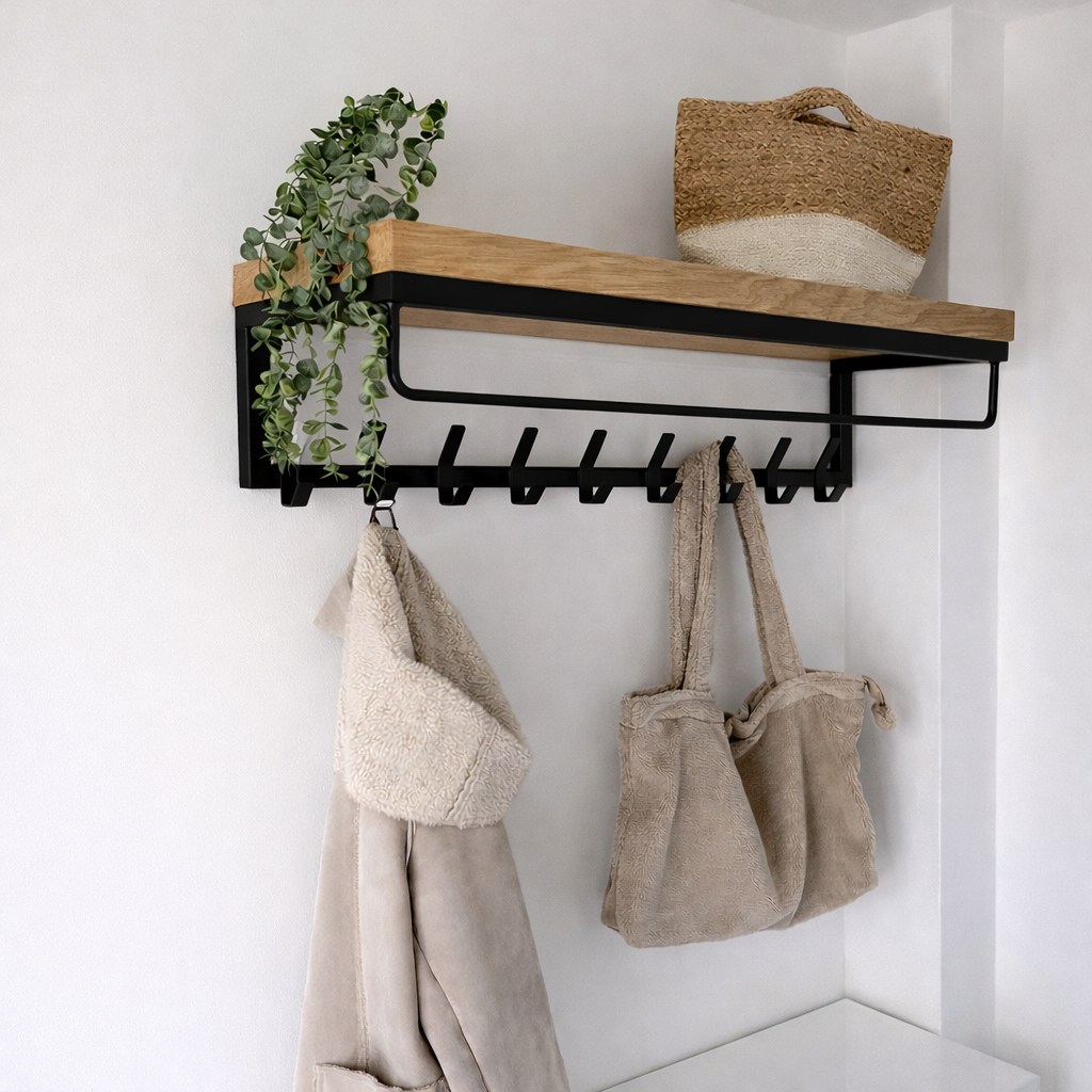 - Eiken plank: Elke kapstok is voorzien van een massieve eiken plank van 4 cm dik, wat niet alleen bijdraagt aan de stevigheid, maar ook aan een natuurlijke en unieke uitstraling.