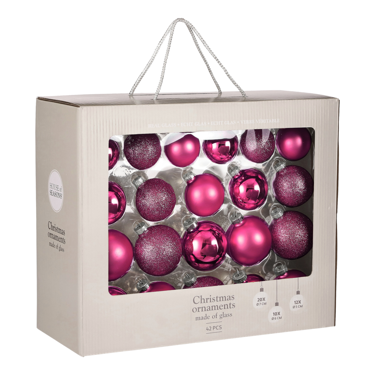 Met deze House of Seasons kerstballen wordt het decoreren van je kerstboom nog leuker! De set bestaat uit maar liefst 42 stuks, dus je hebt gelijk een mooie basis. De kerstballen zijn gemaakt van glas en hebben een fuchsia kleur. Ideaal voor een warme en toch feestelijke uitstraling! Er is een glimmende en een glitter variant in verschillende afmetingen. Zo zijn er 20 kerstballen van Ø7 cm, 12 van Ø5 cm en 10 van Ø6 cm. Leuk om te combineren met andere kerstboom decoratie uit de House of Seasons collectie!